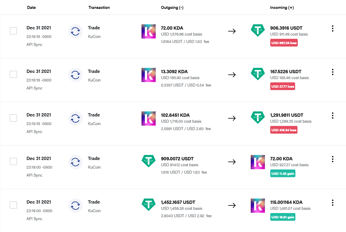 For the 2022 tax year, due to changes in billing models for Cointracker, and the introduction of complimentary tax software provided by Crypto.com, I decided to use Crypto.com's tax software. However, to my surprise, the Kucoin transactions from my attempted wash sales were not included in the 2022 tax year! Instead, those transactions were listed at 11:18 pm in 2021, the actual local time of those transactions in PST. Thus, the losses were neither included in 2021 nor 2022!