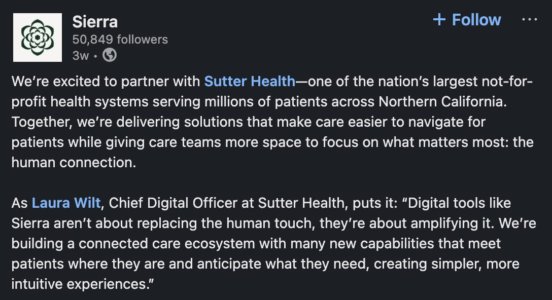 Sierra partners with Sutter Health - LinkedIn: